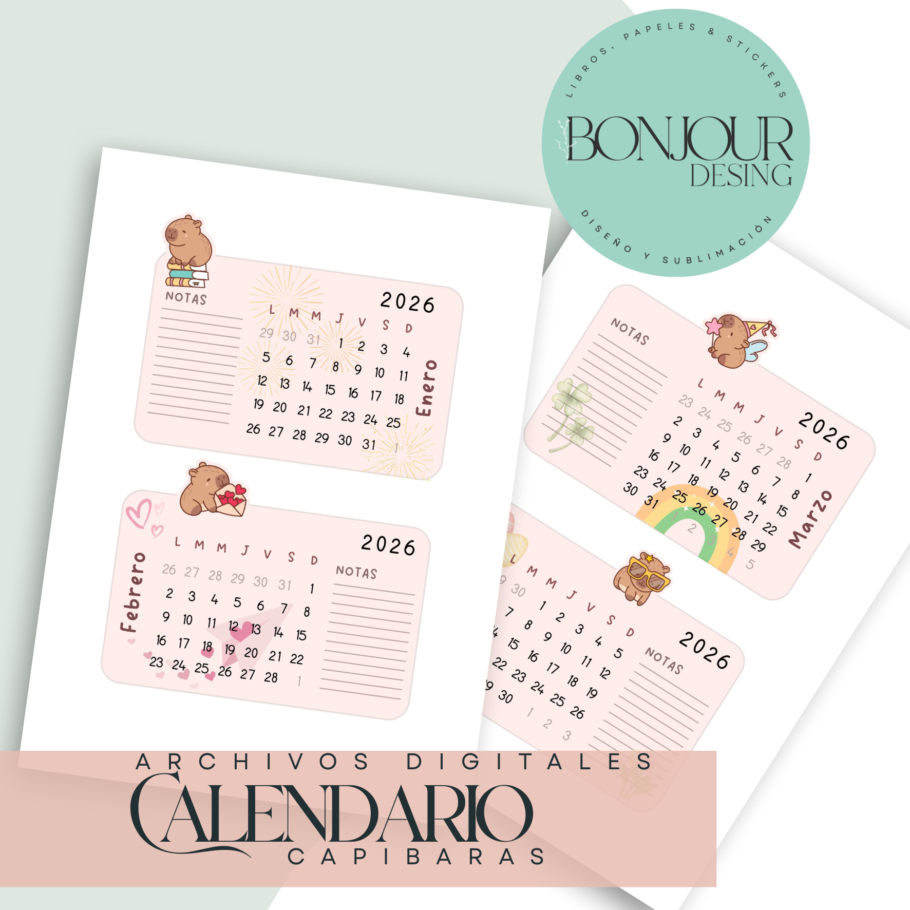 Hermoso calendario 2026 tematica Capibaras, para escritorio. Podes imprimirlo en tu hogar y recortarlo. Incluye modelo de Base.